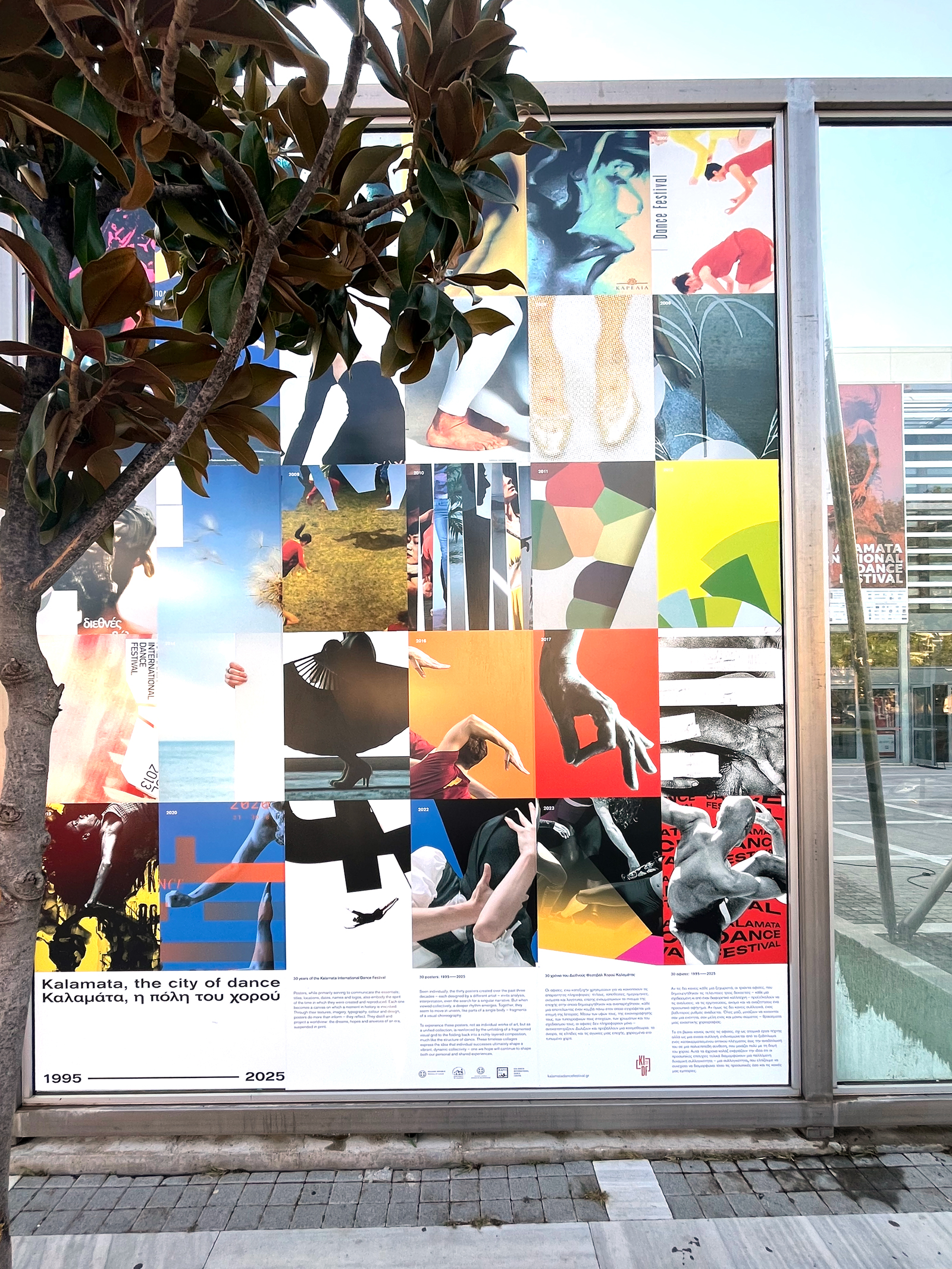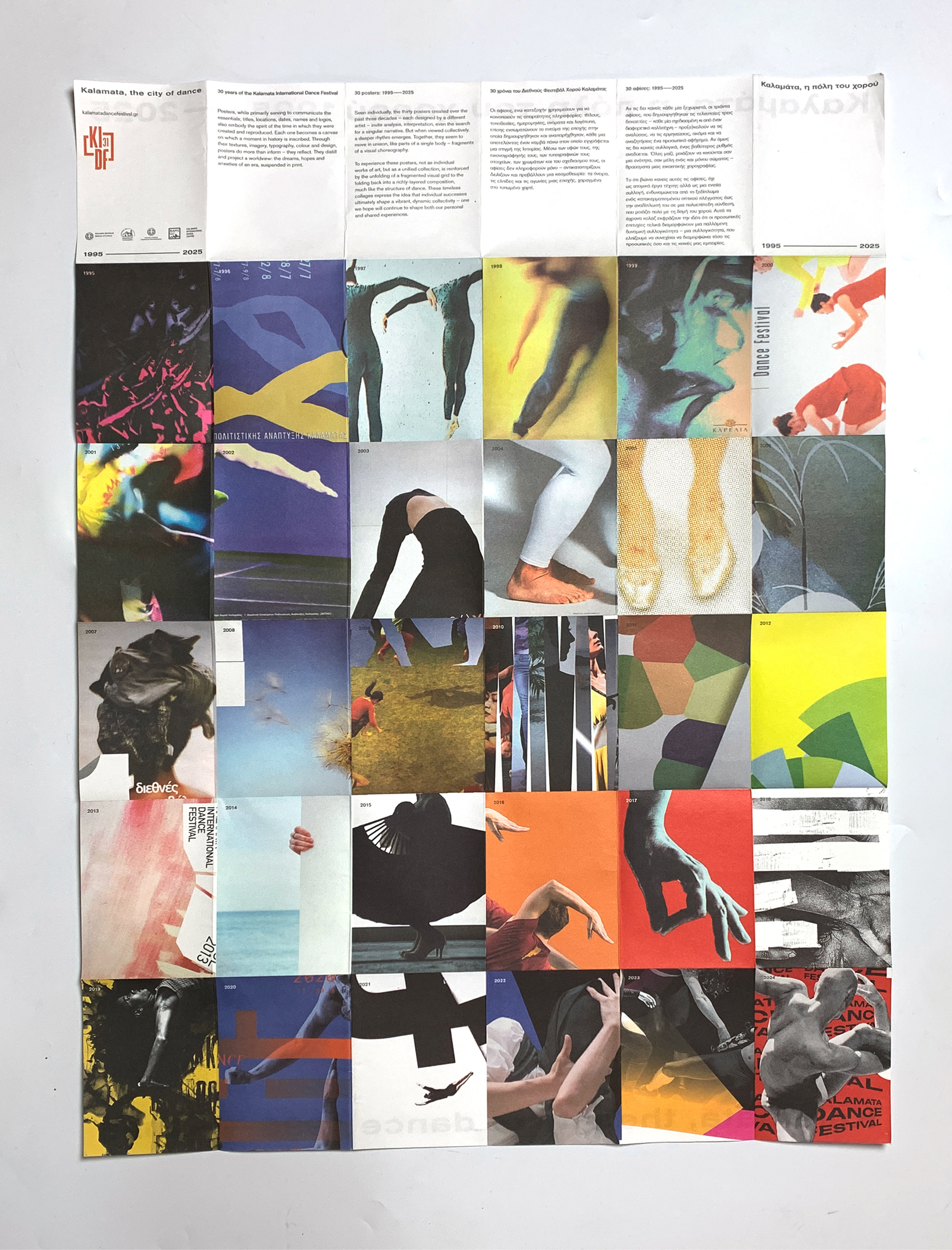 Graphic paraphernalia for an exhibition “Kalamata, the City of Dance — 1995–2025”, showcasing the 30-year history of Kalamata International Dance Festival through archival material – posters, programs, publications, photographs, videos – as well as new creations. A text we did write for the booklet—poster expressed well our intentions we believe: