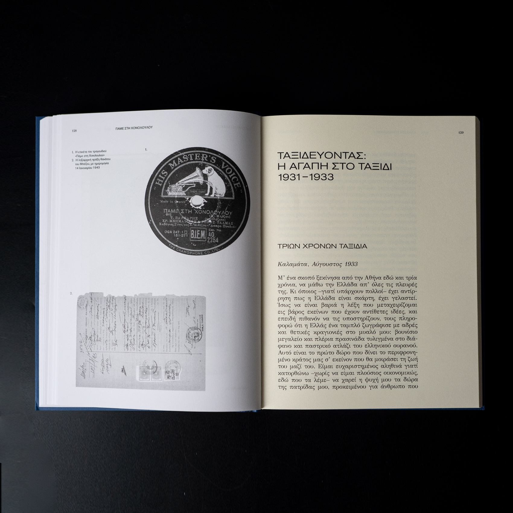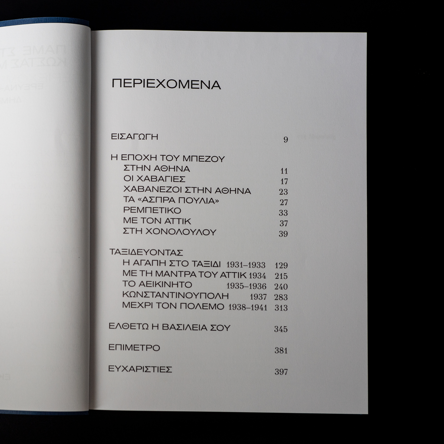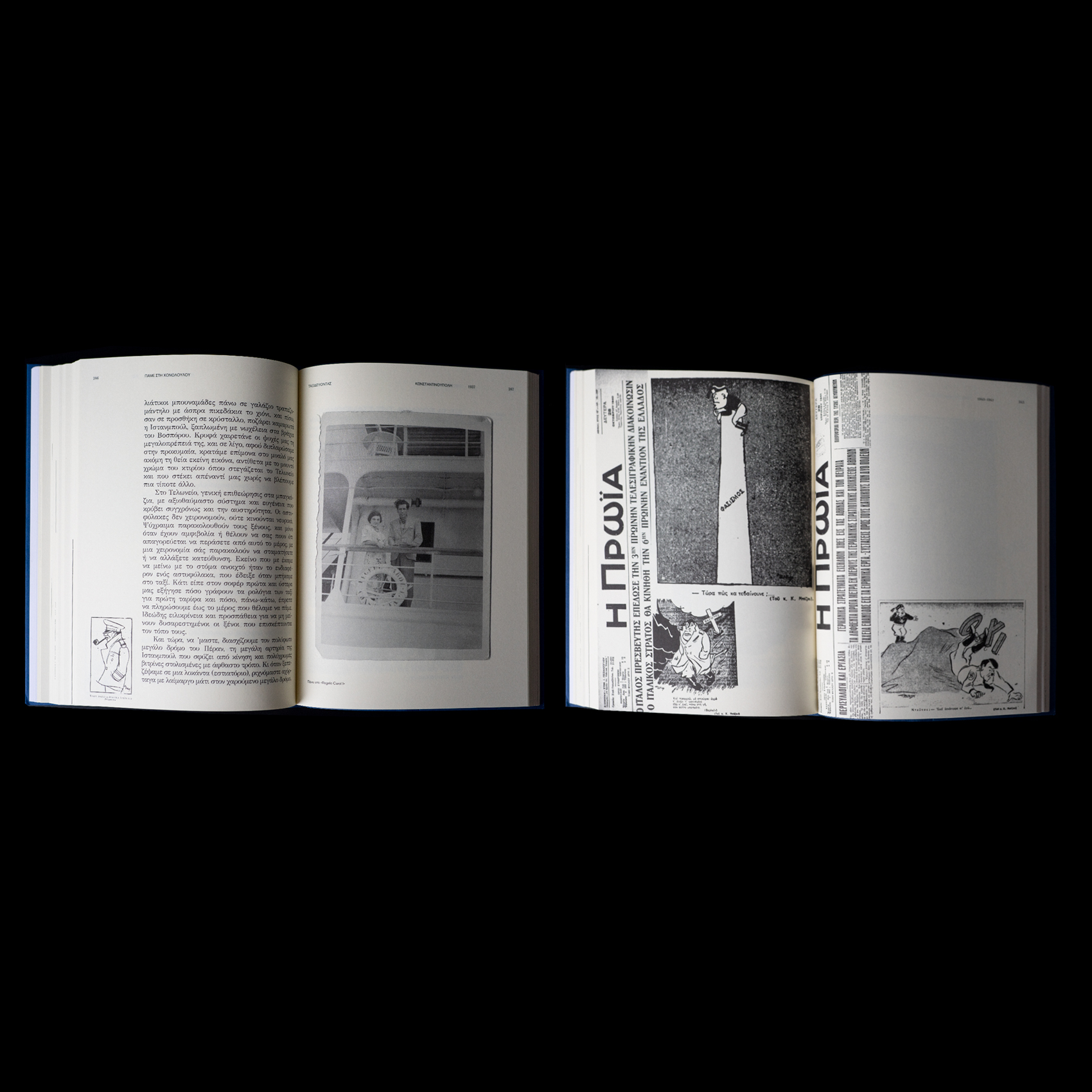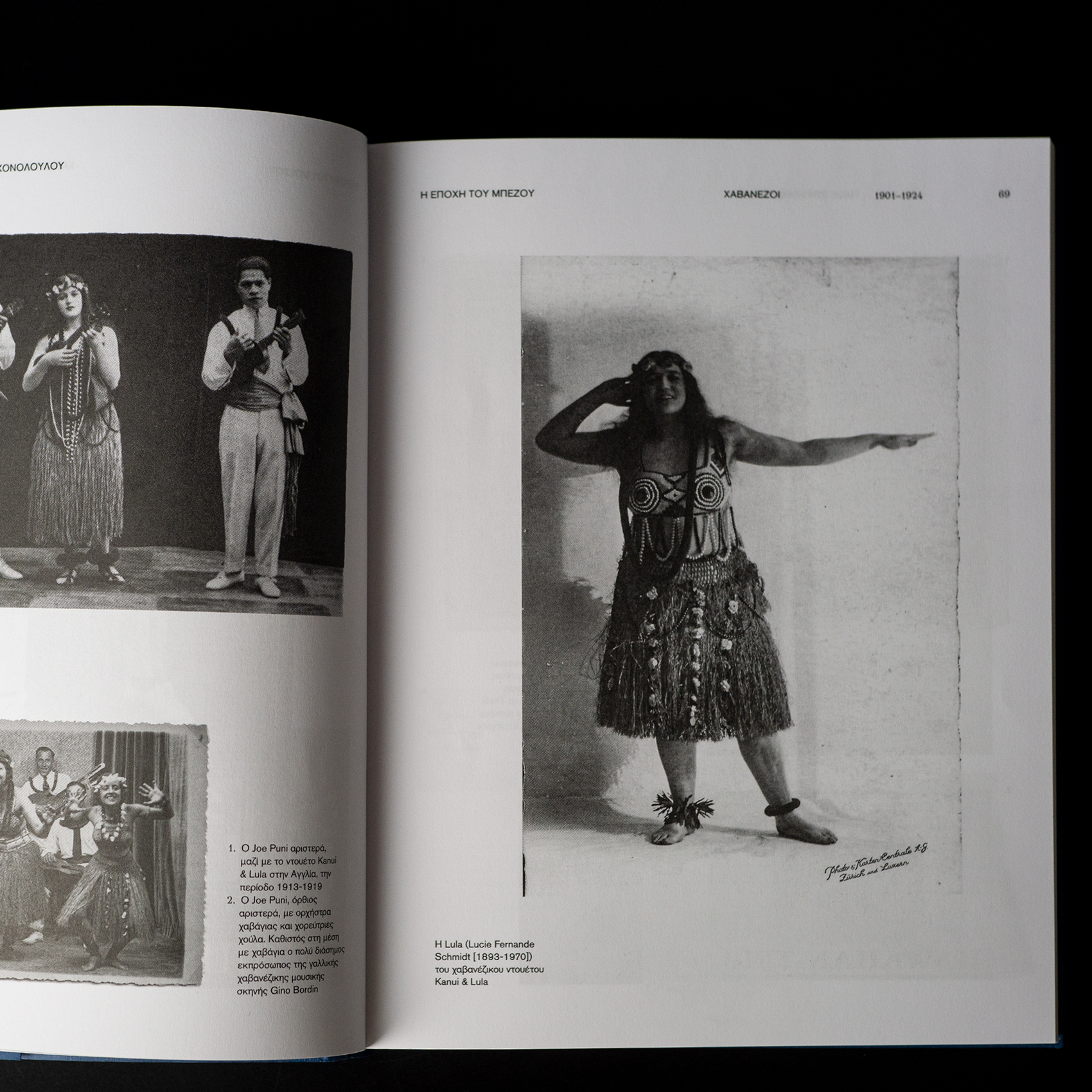 In Hawaiian, honolulu means “protected bay.” Kostas Bezos (1905-1943), a cartoonist and musician, sought to realize in dreamy artificial paradises all the real journeys he had not had the chance to make. But what was Honolulu for him? A cove of his imagination or a place he did not manage to go? Hawaiian music, exotic guitars, sketches, midnight cabaret, tours in Greece, the Balkans, Egypt and Turkey are intertwined in a single narrative, capturing the portrait of an era and creating a different story from the one recorded by the official history of Greece between the wars. The typographic orchestration navigates between narration and archive be using a column structure to slide scales and times giving a reading rhythm.