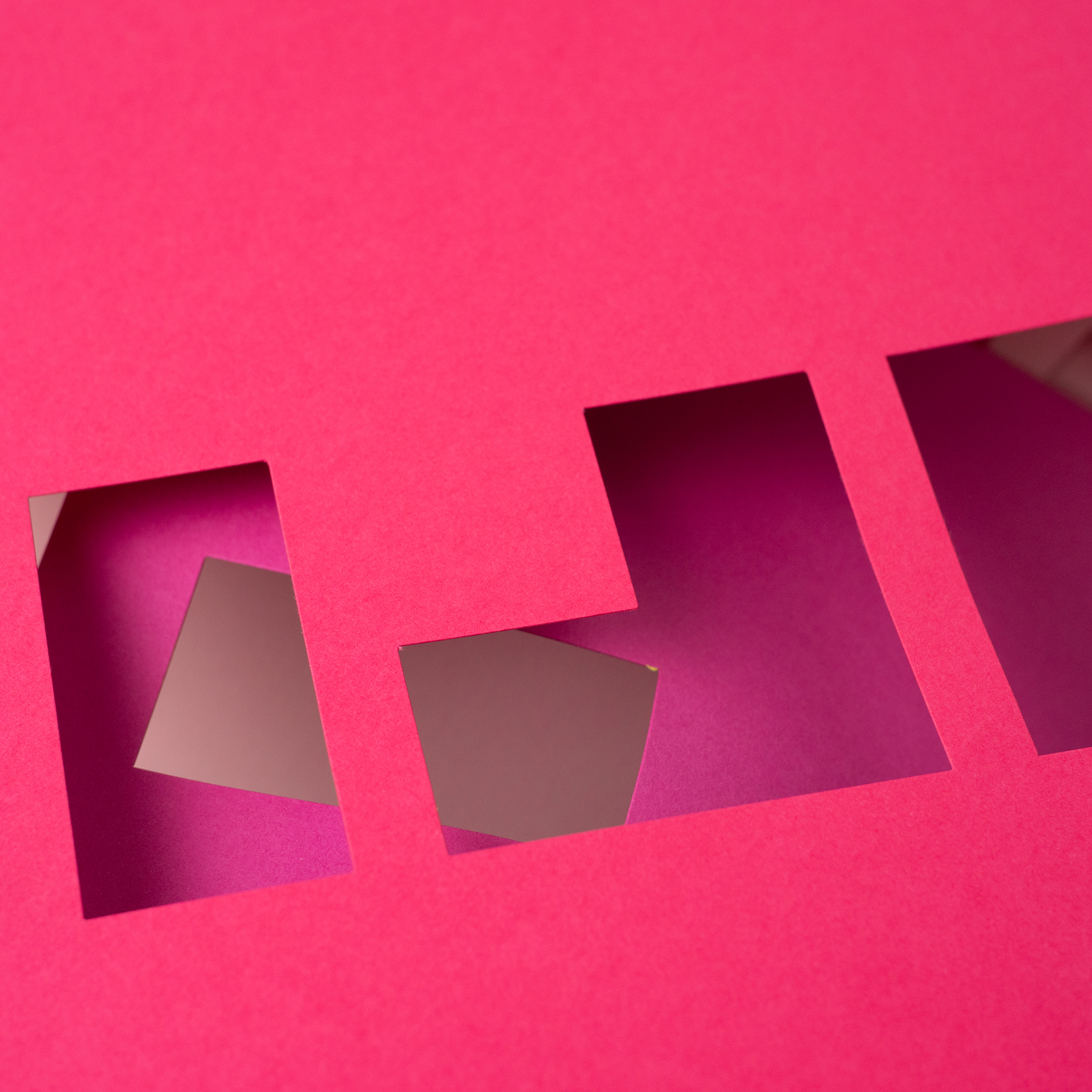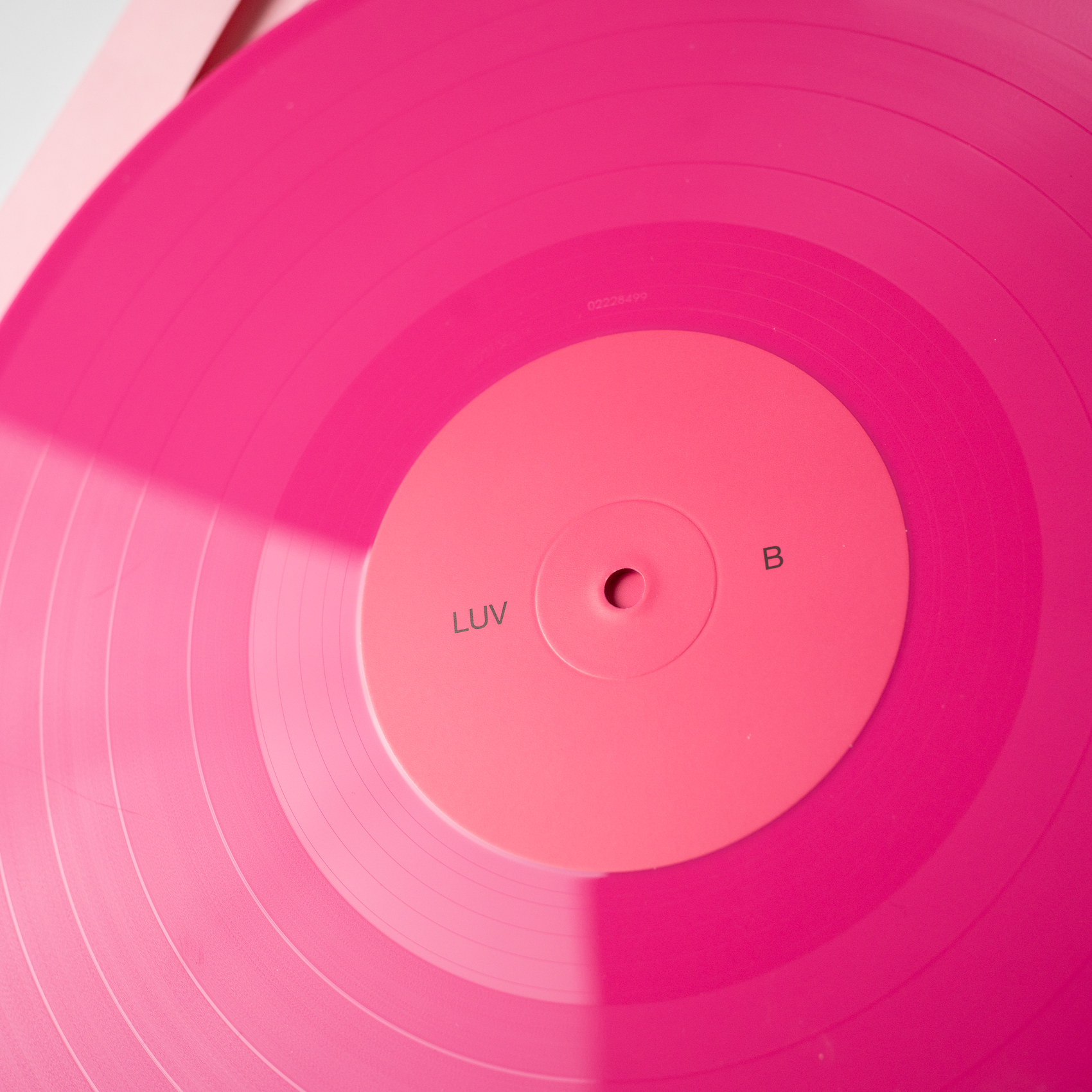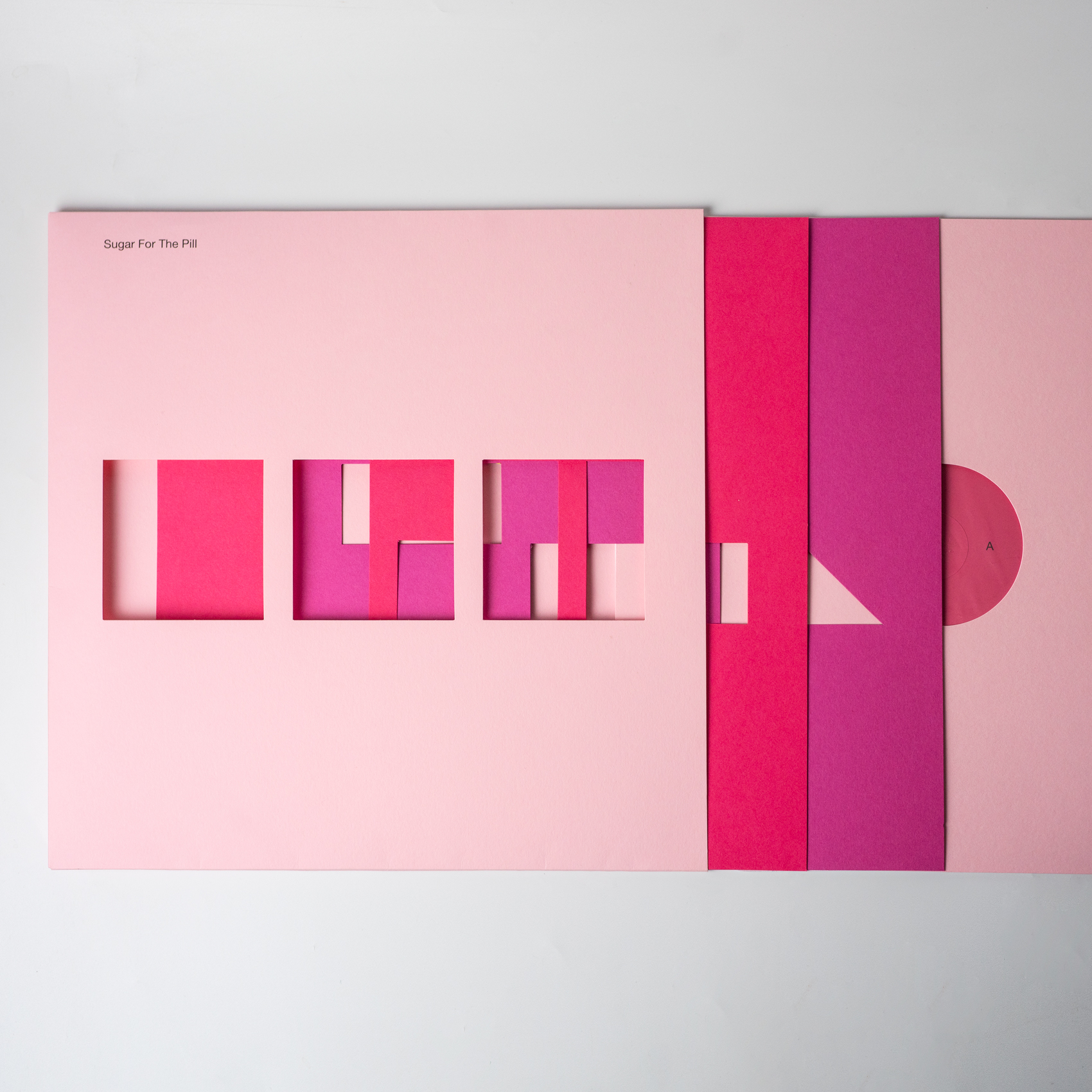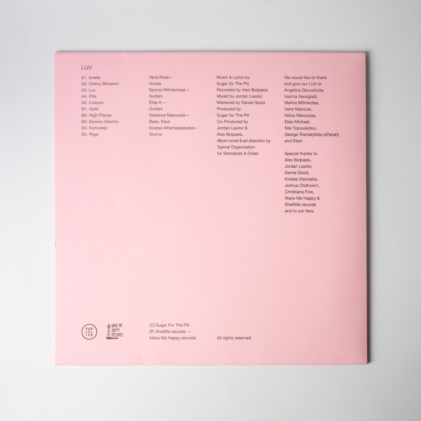 LUV is the second album by Sugar for the Pill and the second typical exercise on their enclosure of sound. It consists entirely of layers of pink Colorplan papers. Through a series of diecuts based on basic geometric forms—circle, square and triangle—the word LUV is implied from the interplay of seen and unseen these layers. The record is pressed in pink or transparent vinyl with a matching label, that is a part of the object itself, being visible throught the diecuts array. Between Marusankakushikaku (○△□), Paul Renner’s geometric discipline, LUV reflects on how form, color, and emptiness and coexistence. Komorebi among the cherry blossoms.